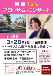 シンガーソングライターの待良さんのコンサートを下記の通り開催いたします。